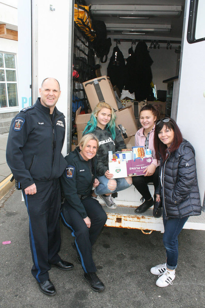 Saanich Police members happily participated in Colquitz Middle School’s Cram the Cruiser event, sending several police cars and a police truck to help transport the goods.